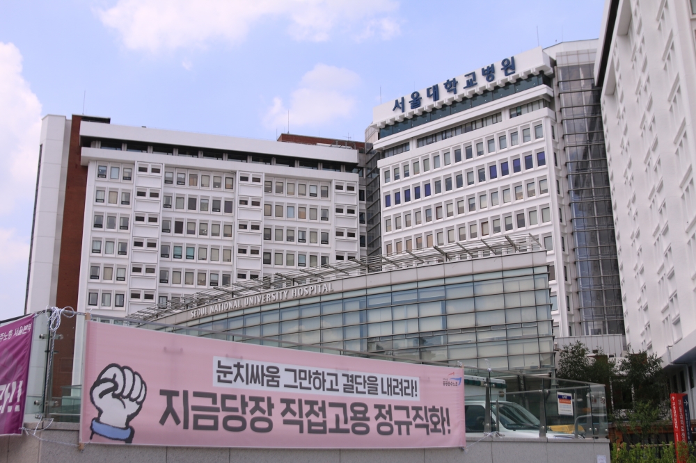 지난 5월 7일 점심시간, 서울대병원 본관 앞에 130여 명의 노동자들이 모였다. 파견용역 노동자들을 정규직으로 전환해 서울대병원이 직접고용할 것을 요구하기 위해서였다. 노동자들은 5월 7일 당일부터 요구가 관철될 때까지 무기한 천막농성을 시작했다.