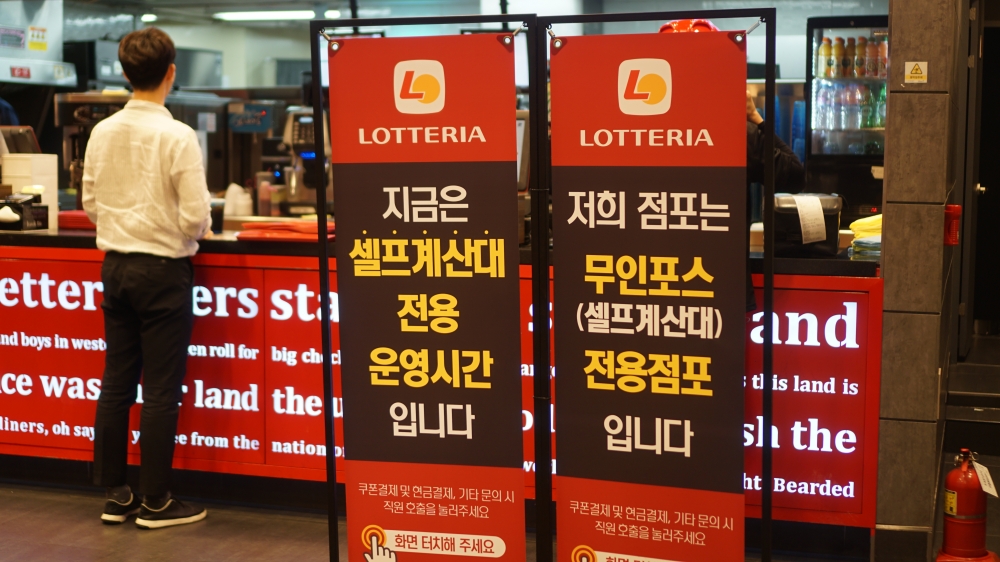 줄을 서 있던 중 늘어선 줄이 좀처럼 줄어들지 않았다. 줄의 맨 앞에서 주문을 하던 사람이 횡설수설하다 카드를 뽑아들고 밖으로 나가는 모습이 보였다. 따라나가 왜 주문하다 말고 나갔는지 물었다. 20대인 A씨는 신용카드로 결제를 하려는데 IC칩이 인식되지 않아 다른 매장에 가려 한다고 답했다. 직원 호출을 하면 되지 않냐고 물으니 키오스크와 주방의 거리가 너무 먼 데다 “(안내문에) 무인주문시간이라고 크게 써 있어 부담스럽다”고 말했다. 실제로 약 80석 규모의 ‘ㄹ’ 매장은 키오스크 네 대를 설치한 ‘무인포스 전용점포’로 모든 주문을 키오스크를 통해서만 받고 있었다. 키오스크에선 현금결제는 불가능해 이를 위해선 직원을 호출해야 했다.