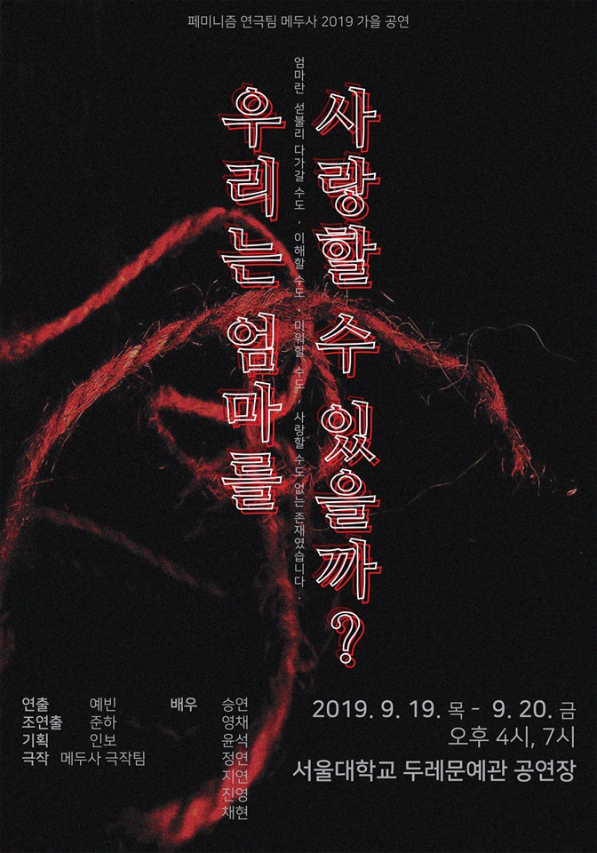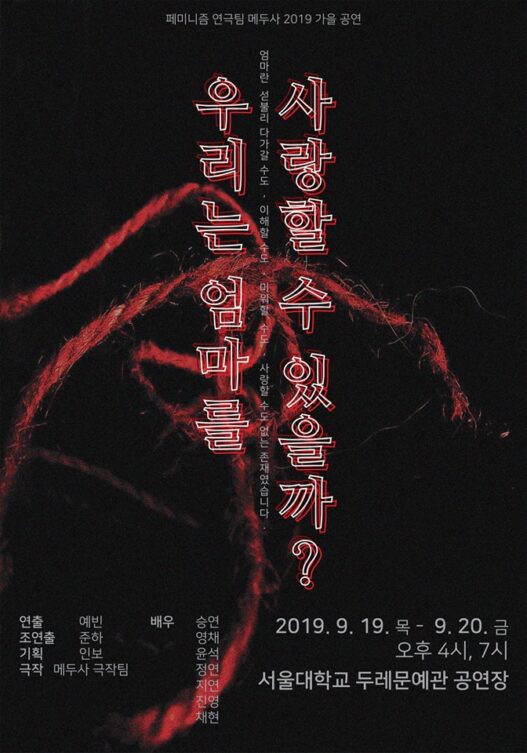 ‘우리가 마주한 여성혐오를 드러내 빛에 쏘이고 가려진 목소리들을 듣고 나누기 위해 무대 위에서, 말하고 행동하고 울고 웃기’. 메두사의 페이스북 페이지 소개 글의 일부다. 메두사는 작년 여름 모놀로그 ‘히스테릭’을 시작으로 올해 3월에는 미러링을 담은 ‘메갈리아의 딸들’을 무대에 올렸다. 태풍 ‘링링’이 찾아온 어느 날, 세 번째 연극 ‘우리는 엄마를 사랑할 수 있을까?’ 공연 준비가 한창인 연습실을 찾아 이들의 얘기를 담았다.
