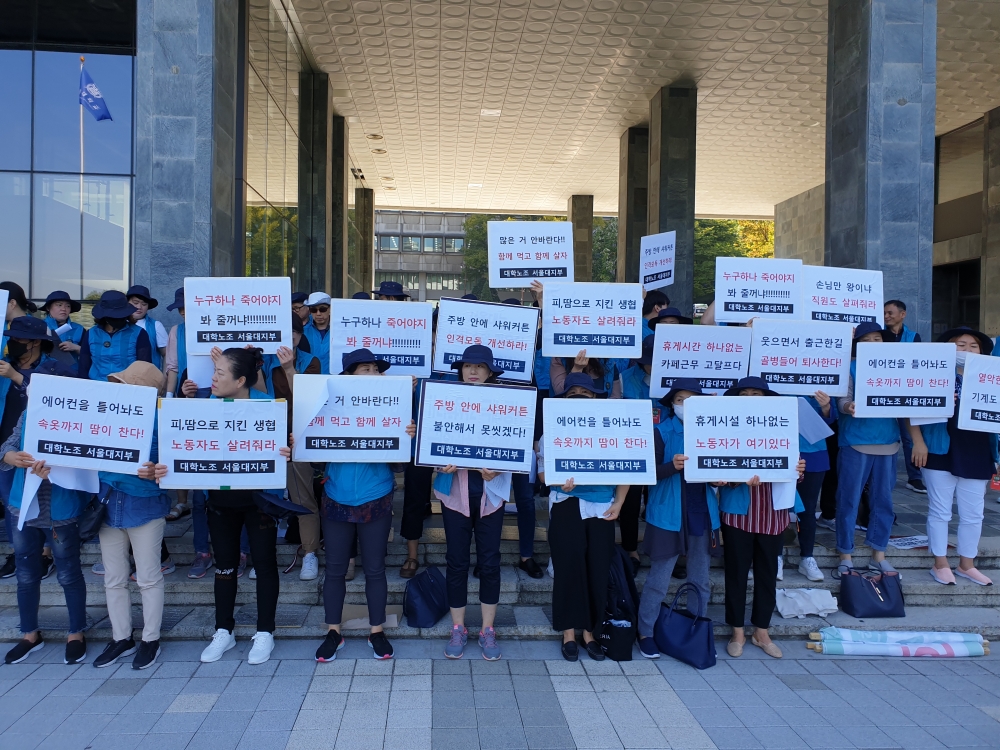 19일 오전 민주노총 전국대학노동조합 서울대지부(대학노조)와 비정규직 없는 서울대 만들기 공동행동(비서공)은 행정관(60동) 앞에서 집회를 열고, 생협 노동자들의 노동조건 개선을 요구했다. 노조 측은 “현재 생협 노동자들의 1호봉 기본급은 최저임금 수준에도 못미치는 171만 5천 원에 불과하며 세금을 제외하고 실제로 받는 금액은 150만 원 정도”라며 “노동강도 역시 매우 높아 인력 충원조차 힘든 실정”이라고 밝혔다. ‘비정규직 없는 서울대 공동행동’ 측은 이날 성명문을 통해 학생회관 식당에서는 서른 명의 노동자가 하루 6천 명분의 식사를 준비하고 있으며, 이들은 땀띠나 관절 통증 등의 질환에 항상 시달리고 있다고 밝혔다.