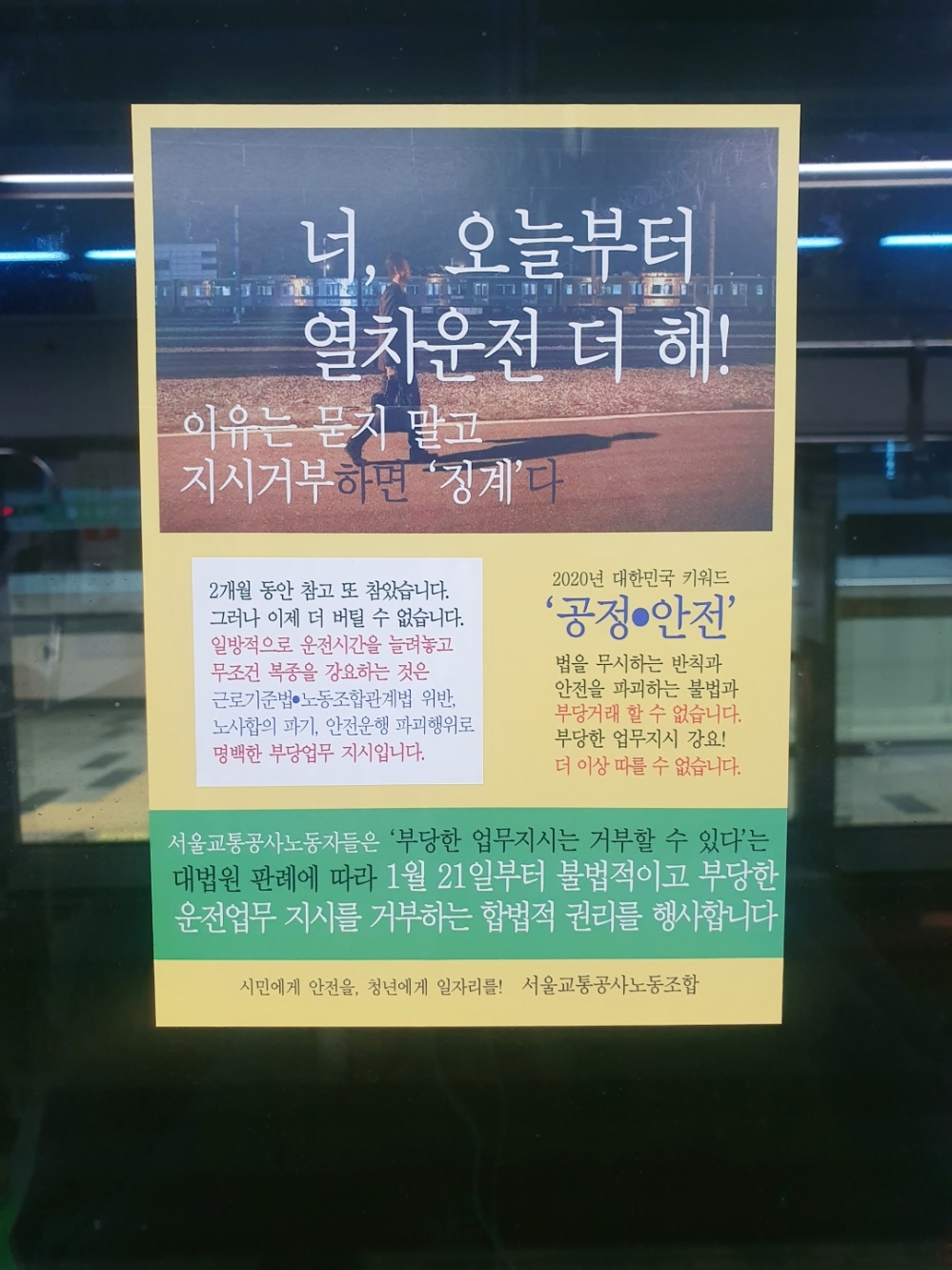 지난해 10월 14일, 서울교통공사노동조합(서울교통공사노조)은 4개월 동안 진행된 노사교섭에서 합의점을 찾지 못하고 총파업을 선언했다. 파업 돌입 직전인 16일, 서울교통공사 측과의 협상이 극적으로 타결돼 지하철은 정상 운행됐으나 갈등은 해소되지 않았다. 올해 1월엔 전동차 출입문 곳곳에 서울교통공사노조 승무노동자들의 입장이 담긴 전단지가 붙었다. 노조가 지난해 11월 사측이 지시한 일방적인 근무시간 변경에 대해 철회를 요구하며 작업거부를 선언한 것이다. 당시 노조는 21일에 예고한 작업 거부에 승무분야 3,250명 인원 중 90%에 육박하는 2,830명의 참여를 예상했고 소식이 전해지자 지하철 대란이 초래되는 것 아니냐는 우려가 커졌다. 승무노동자들은 대중교통 이용 불편에 대한 비난의 화살을 감수하고서라도 목소리를 내고자 했다. 이는 승무 노동을 둘러싼 문제가 그만큼 심각하다는 증거다. 승무노동자의 노동실태를 돌아보고 첨예한 노사 간 대립 상태를 살펴봤다.