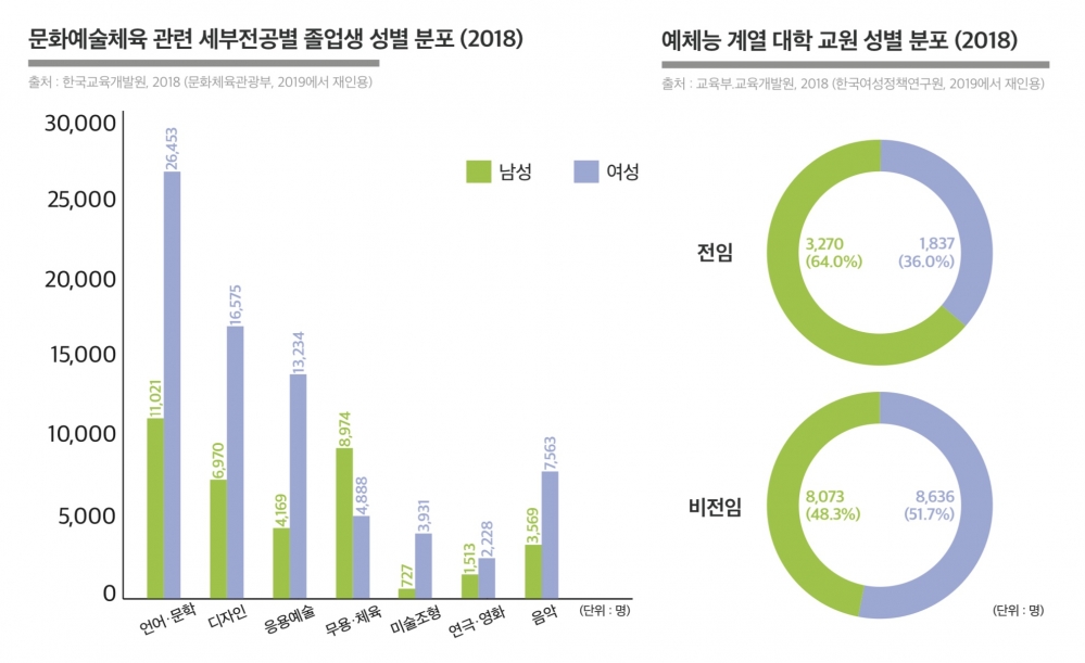 문화예술계는 학생의 ‘여초(女超) 현상’이 두드러진다. 2018년 한국교육개발원 교육통계서비스에 따르면, 문화예술체육 관련 세부전공 중 언어문학·디자인·응용예술·미술조형·음악 전공의 졸업생 성별 분포에서 여성 비율이 남성보다 두 배 이상 높게 나타났다. 예술대학 전임교원의 성비는 이와 대조적이다. 같은 해 교육부 교육개발원에서 발표한 ‘교육통계분석자료집 : 고등교육통계편’에서 예체능 계열 대학의 전임교원 비율은 남성 64%, 여성 36%로 집계됐다. 즉 예술교육자의 성비엔 교육을 받는 당사자인 학생의 성비가 반영되지 않는다.