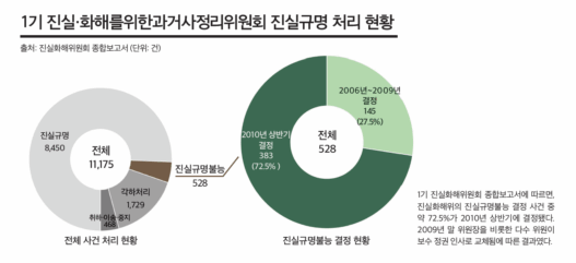 1기 진실화해위는 출범 당시 독립기관을 표명했으나 독립적인 권한을 행사하기 어려웠다. 예산과 인사권 등에 있어 행정안전부로부터 자유로울 수 없었으며, 정권 교체의 영향도 무시하지 못했다. 1기 진실화해위 활동 기간 도중 정권 교체가 일어나면서 진실화해위 구성원에도 변화가 생겼다. 1기 진실화해위에서 조사관으로 근무했던 성공회대 김상숙 연구교수는 “2009년 말에서 2010년 무렵 노무현 정부에서 임명한 위원들의 임기가 끝났고 이명박 정부가 들어서며 (진실화해위) 구성이 변경됐다”고 말했다. 보수 정권 인사들로 구성이 변경되며 남은 활동 기간 동안 진실화해위의 과거 청산 기조도 바뀌었다. 김 교수는 “진실규명 시 내용을 축소하기도 하고, 진실화해위 말미에 다뤘던 미국폭격사건 등은 진실규명 불능이나 각하결정을 했다”고 당시 느꼈던 아쉬움을 말했다. 실제로 1기 진실화해위의 진실규명 불능 사건 528건 중 72.5%가 2010년 상반기에 결정됐다.