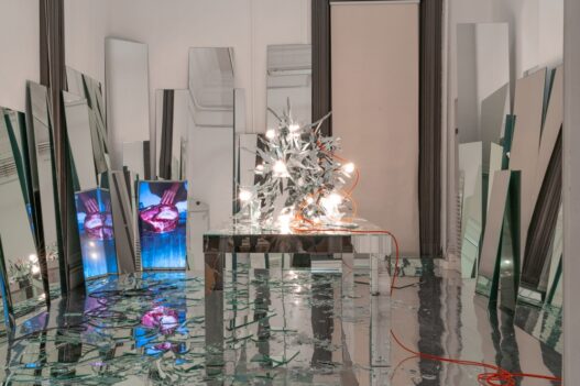 2층에는 박유아가 2010년대 초반에 작업한 「르쌍띠망-효」와 「뮤직박스」 연작이 있다. 「르쌍띠망-효」는 퍼포먼스와 설치가 결합된 작품이다. 퍼포먼스에서 박유아는 거울로 된 식탁에 생고기를 올려두고 한 가족의 식사 자리를 연출한다. 식탁 주변에는 작가 본인의 부모와 형제의 초상화가 걸려있다. 박유아는 인주를 바른 얼굴로 초상화들과 대화해보려 하지만 소통은 이뤄지지 않는다. 주위에 설치된 거울이 같은 이미지를 투영하고 반사해, 박유아는 마치 영원히 나갈 수 없는 거울의 방에 갇힌 듯하다. 껍데기뿐인 식사의 소통 불가능성이 극에 달한 순간 박유아는 생고기를 찢으며 거울을 깬다. 퍼포먼스의 현장은 이번 전시에 그대로 재현된다. 생고기를 찢고 거울을 깨는 퍼포먼스는 각각 생고기를 해체하는 영상 작품 「미트」와 바닥에 흩어져있는 거울 파편으로 대체됐다.
