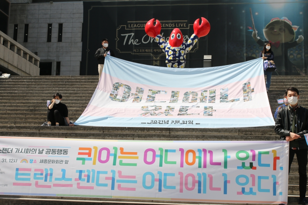 광화문 광장에서 ‘우리가 여기에 있다’는 선언이 울려퍼졌다. 수요일(3월 31일) 정오, 세종문화회관 앞에서 국제 트랜스젠더 가시화의 날을 맞아 기자회견이 열렸다. 3월 31일은 국제 트랜스젠더 가시화의 날로, 트랜스젠더들의 존재를 세상에 드러내기 위해 지정된 국제 기념일이다. 기자회견은 성소수자차별반대 무지개행동, 청소년 성소수자 위기지원센터 띵동, 행동하는성소수자인권연대, 청소년 트랜스젠더 인권모임 튤립연대, 트랜스해방전선, 트랜스젠더 부모모임, 성별이분법에 저항하는 사람들의 모임 여행자 등 8개 단체의 공동 주최로 진행됐다. 지난 두 달간 이은용 극작가와 김기홍 전 제주퀴어문화축제 조직위원장, 변희수 하사의 부고가 잇따랐던 가운데 이날 기자회견은 애도의 분위기 속에 이뤄졌다.