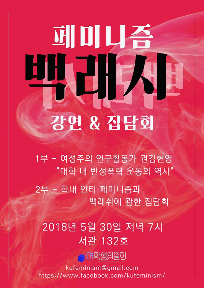 5월 30일 고려대학교 여학생위원회(여학위)는 권김현영 교수를 초청해 ‘여성주의 백래시’ 강연 및 집담회를 열었다. 강연 및 집담회의 배경에는 연세대 총여학생회(총여) 폐지 운동과 고려대 내 여성주의 소모임에 대한 공격 등 대학가 전반에서의 여성주의 탄압이 있었다. 고려대 여학위 효원(경제학과) 위원은 “여성주의에 대한 무지나 비판을 넘어 거대한 흐름이 되고 있는 백래시에 맞서 학생사회의 대안을 찾고 담론을 조성하기 위해 집담회를 준비했다”고 설명했다.