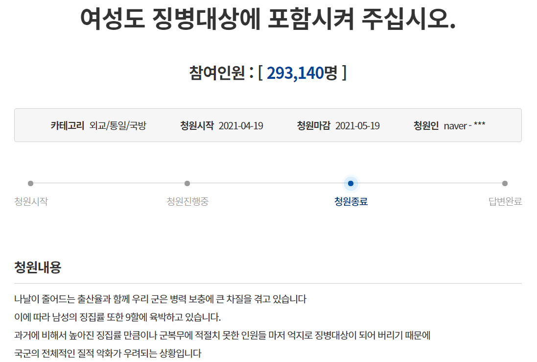 지난 4월 19일 국민청원 사이트에 올라온 ‘여성도 징병대상에 포함시켜 주십시오’라는 제목의 청원에서 작성인은 ‘성평등을 추구하는 현대 사회에서 병역의 의무를 남성에게만 지우는 것이 후진적이고 여성비하적’이라고 주장했다. 남성만이 군대에 가는 현 상황이 평등하지 않으며, 여성징병제를 통해 성평등을 이룰 수 있다는 것이다. 해당 청원에는 29만여 명의 동의가 이뤄졌다.