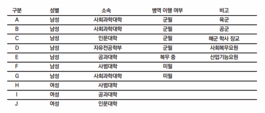 정치인들이 앞다투어 여성징병제를 말한다. 인터넷 커뮤니티에도 여성징병제에 대한 논의가 활발하다. 여성징병제 논의에서 ‘군 복무와 가장 가까이 있는’ 20대의 목소리는 얼마나 반영되고 있나. <서울대저널>은 서울대학교 학생 10인의 이야기를 각각 듣고 모았다. 이들은 ‘군대 하면 떠오르는 키워드’로 각각 ‘노예’(A) ‘몰인간성’(B) ‘남초집단’(C) ‘지켜주다’(D) ‘시간’(E) ‘수양’(F) ‘억울함’(H) ‘가기 싫다’(I), ‘위험’(J)를 꼽았다.
