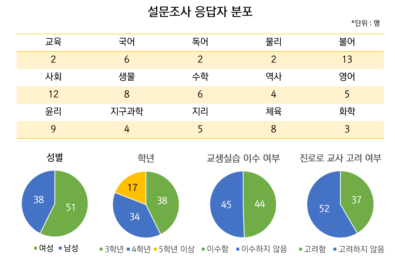 사범대생이 체감하는 교사양성 현장은 어떨까. 교육과정에 대한 서울대 사범대생의 목소리를 직접 들어봤다. <서울대저널>은 10월 1일부터 10월 9일까지 교육학과를 제외한 3학년 이상의 사범대생을 대상으로 설문조사를 실시했으며, 사범대 내에서 복수전공하고 있는 교육학과 학생 두 명을 추가했다(N=1011). 지원자 표집에 의해 총 89명이 설문조사에 응답했다. 응답자 분포는 <그림 1>과 같다. 본 설문조사 진행에 있어 임동균 교수(사회학과)의 자문을 받았다. 비대면 강의 진행 상황에서 표본 수를 충분히 확보하는 데 한계가 있었다. 조사요청 인원(1011명) 대비 응답 비율은 8.8%다.