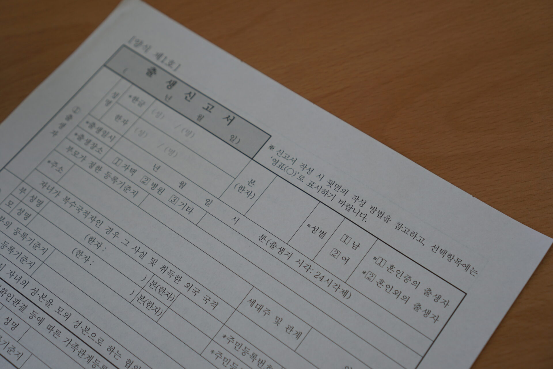 사진 설명 시작. 주민센터에서 촬영한 출생신고서. ‘혼인 외 출생자’와 ‘혼인 중 출생자’ 칸이 명확히 나뉘어 있다. 미혼부가 홀로 작성하여 제출한 출생신고서는 주민센터에서 받아주지 않는다. 사진 설명 끝.