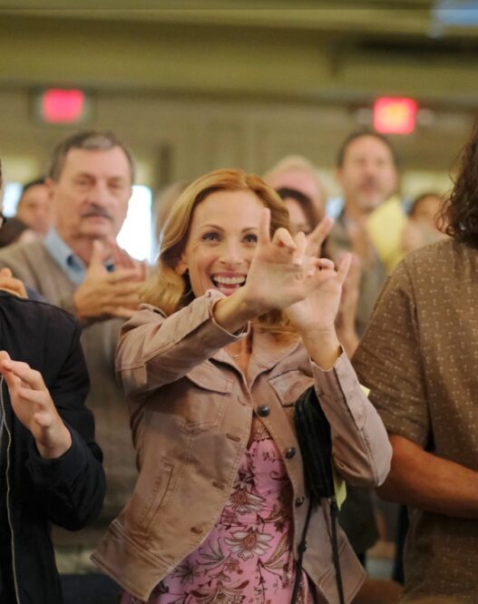 사진 설명 시작. 불이 켜지지 않은 상태의 전구 몇 개가 공중에 걸려 있고 가운데에서 두 김이박이 포옹을 하고 있다. 왼쪽에는 76년생 김이박, 오른쪽에는 92년생 김이박이 있고 두 사람은 서로의 팔을 등에 감아 힘껏 껴안고 있다. 눈을 감고 감정에 찬 얼굴을 한 92년생 김이박이 보이고 76년생 김이박의 얼굴은 그 뒤에 흐릿하게 있다. 사진 설명 끝.