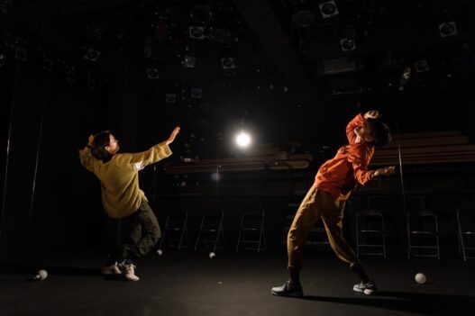 사진 설명 시작. 어두운 무대 정중앙에 전구 모양의 흰 조명 하나가 밝게 빛나고 있다. 전구를 사이에 두고 두 인물, 두 명의 김이박이 서 있다. 둘 다 팔을 위로 들고 몸을 뒤로 젖히며 허우적거리는 자세를 하고 있다. 두 사람의 표정은 잘 보이지 않는다. 바닥에는 불이 들어오지 않은 흰 전구가 양 끝에 하나씩 놓여 있다. 사진 설명 끝.