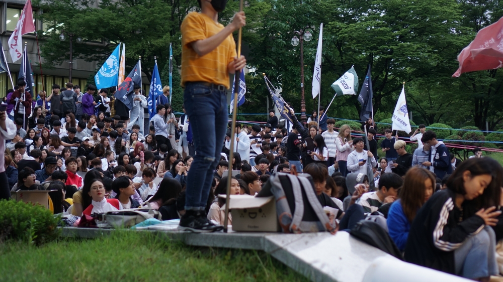 해가 저물고 완전히 어두워지기 전, 중앙도서관 앞 아크로폴리스에 학생들이 모여있다. 많은 사람들이 빽빽하게 자리를 채워 앉아있고 인파 사이에 각 단위의 깃발을 들고 있는 이들이 섞여 있다.