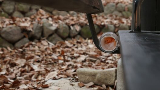 사진 설명 시작. 흩어져있는 낙엽 사이로 빨간 국물이 물든 나무 젓가락이 흩어져 있다. 오른쪽에는 PD의 발과 다리가 보인다. 사진 설명 끝.