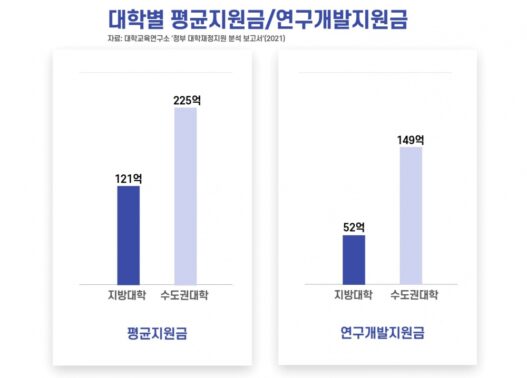 인포그래픽 설명 시작. 수도권대학과 지방대학의 평균지원금과 연구개발지원금을 비교한 결과, 지방대학은 수도권대학에 비해 절반에 미치지못하는 지원금을 받고 있다. 인포그래픽 설명 끝.