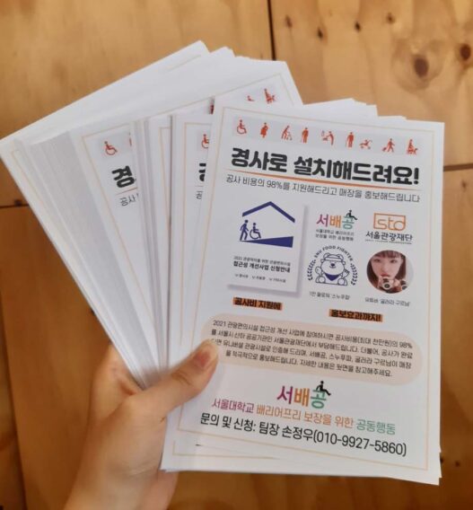 경사로 설치가 가능해 보이는 식당은 40여 곳이었다. 관악캠퍼스 인근의 경우 경사로 설치가 불가능한 식당이 더 많았다. 식당 입구가 도로와 너무 가깝거나 입구의 턱이 너무 높기 때문이다. 서배공은 40여 곳에 방문해 경사로 설치를 제안했다. 올해는 서울관광재단과 협업해, 경사로 설치 및 비용 조달을 재단이 맡고 실태 조사와 업주 미팅을 서배공이 담당한다.