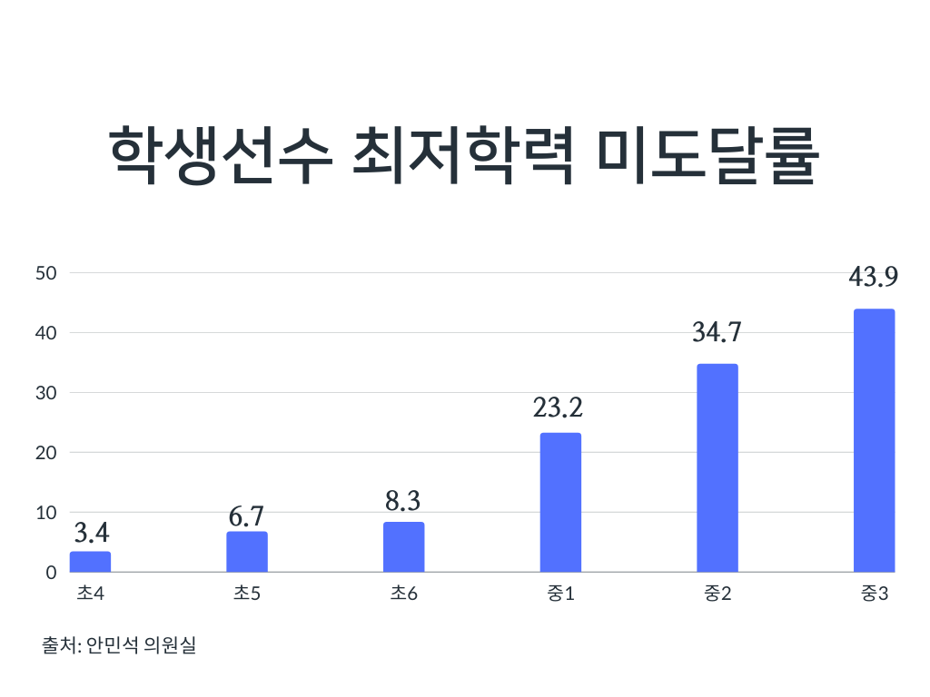 잦은 훈련과 대회 출전으로 인한 학습 결손은 학생선수들의 학력 저하로 이어진다. 인권위 설문 조사에 따르면, 학생선수 중 82.1%는 빠진 수업에 대해 보충 수업을 전혀 받지 않는다고 답했다. 교육부가 제시한 학생선수의 최저학력 기준은 해당 학년 교과별 평균 성적의 50% 이상(초등학교) 혹은 40% 이상(중학교)이다. 최저학력기준에 도달하지 못한 학생선수 비율은 초등학교 4학년의 경우 3.4%에 불과한 반면 중학교 3학년은 43.9%에 달한다. 고학년이 될수록 학습 결손이 심해지는 것이다.