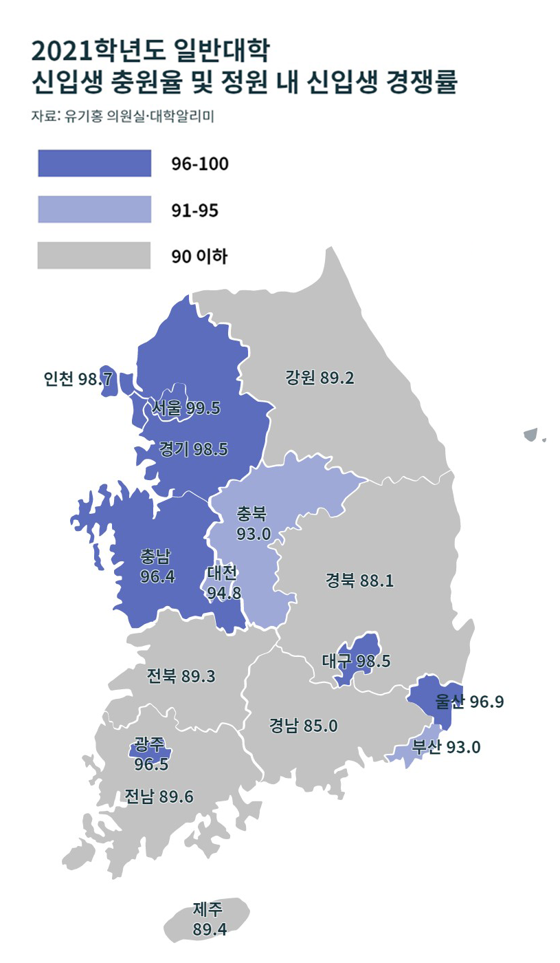 사진설명 시작. 2021학년도 일반대학 신입생 충원율 및 정원 내 신입생 경쟁률을 지역별로 나타낸 지도이다. 자료 출처는 유기홍 의원실과 대학알리미다. 충원율이 96에서 100%인 지역은 수도권, 충남, 대구광역시, 광주광역시, 울산광역시다. 충남과 일부 광역시를 제외한 비수도권 지역은 모두 95% 이하의 충원율을 보인다. 사진설명 끝.