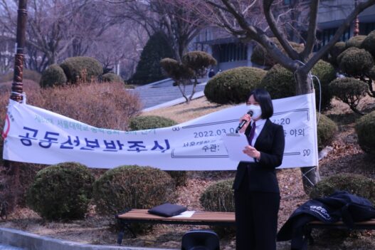 어제(4일) 학생회관 앞에서 제62대 서울대학교 총학생회 공동선본발족식이 열렸다. 이번 선거엔 ‘자정’이 단일선본으로 나섰다. 자정의 정후보로는 김지은(조선해양공학 18) 씨가, 부후보로는 전현철(농경제사회 19) 씨가 출마했다. 자정은 동일한 후보로 지난 11월 총학생회 5차 선거에 출마한 바 있다.