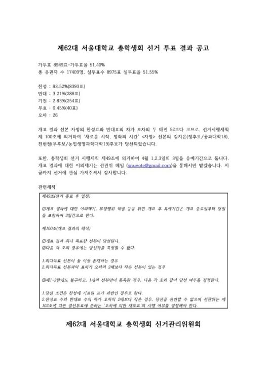 한편 제62대 총학생회 선거는 6번의 선거 끝에 성사됐다. 총학생회 자리가 채워지는 것은 2년 4개월 만이다.
