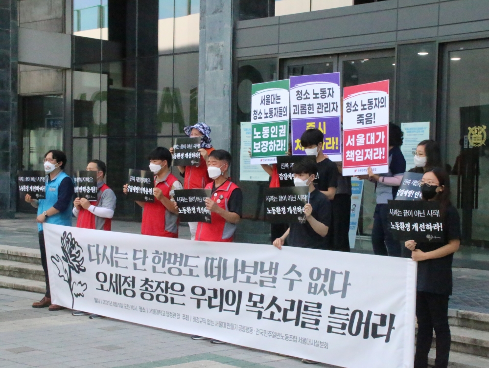 기자회견은 오세정 총장의 청소노동자 간담회에 때맞춰 열렸다. 지난 2일 오 총장은 입장문을 내고 ‘고인과 유족, 그리고 피해 근로자 모든 분들께 깊은 사과의 말씀 드린다’며 ‘금주 내로 유족과 피해근로자분들을 모시고 간담회를 개최하여 위로의 말씀을 드리고 재발방지대책 마련을 위한 현장의 목소리를 듣고자 한다’고 약속했다.