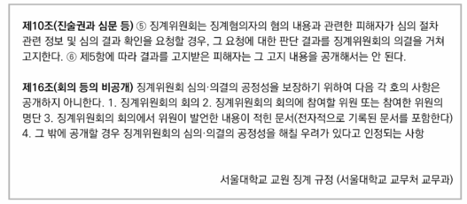 피해자가 C교수의 심의 결과를 알지 못함은 서울대학교 교원 징계 규정에 기인한다. 서울대학교 교원 징계 규정 제10조 5항에 따르면, ‘징계혐의자의 혐의 내용과 관련한 피해자가 심의 절차 관련 정보 및 심의 결과 확인을 요청할 경우, 그 요청에 대한 판단 결과’를 징계위의 의결을 거쳐 고지한다. 또한 피해자가 5항에 따라 판단 결과를 고지받았더라도, 동조 6항에 따라 피해자는 그 고지 내용을 공개해서는 안된다. 반면 교무과에 따르면 피해자가 6항을 위반하여 고지 내용을 공개했을 경우에 대한 후속 징계 규정은 따로 없는 상태다.