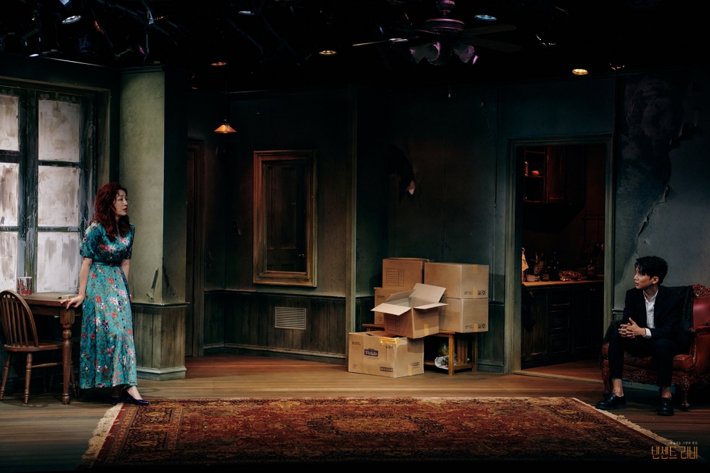 사진 설명 시작. 아니타의 집으로 표현된 무대의 전체적인 모습이 보인다. 아니타는 무대 왼쪽 끝에 놓인 식탁에 걸터앉아 있고, 데이비는 무대 오른쪽 끝에 자리 잡은 소파에 앉아있다. 두 사람은 서로 바라보고 있다. 무대 중앙 뒤쪽에는 아니타가 막 이사온 것을 나타내는 이삿짐 박스가 쌓여있다. 사진 설명 끝.