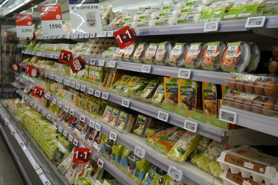 사진 설명 시작. 대형마트 냉장고 가판대에 초록색으로 포장된 가공식품들이 줄지어 진열돼 있다. 사진 설명 끝.