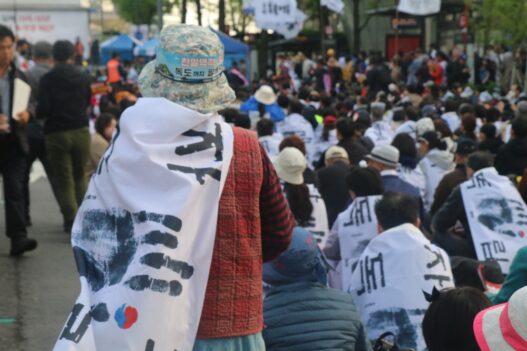사진 설명 시작. 거리에 시위자들이 줄지어 앉아 있다. 사진의 초점은 가까이에 서 있는 한 시위자에 맞춰져 있다. 초점이 맞은 시위자는 카메라에 등을 돌리고 있다. 시위자들이 망토처럼 두른 깃발에는 안중근 의사의 손도장과