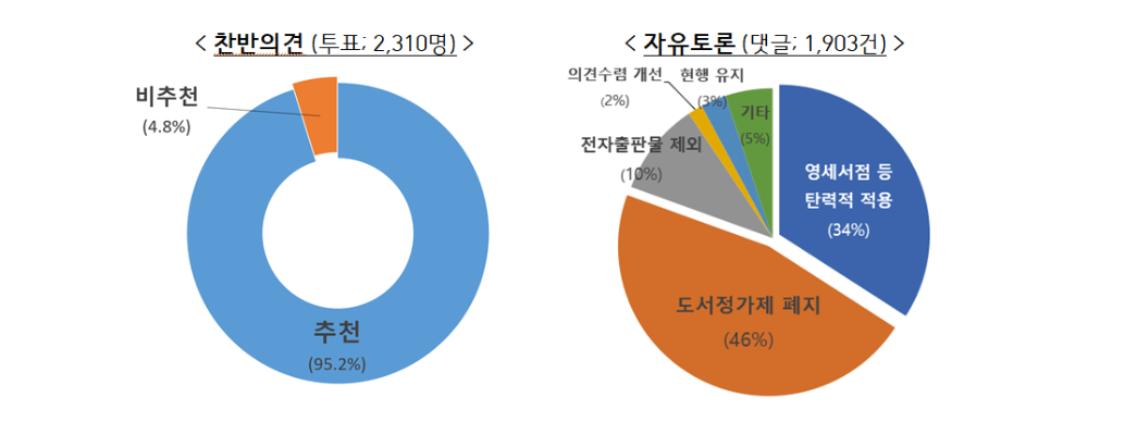 도서정가제를 두고 출판 시장의 다양성과 안정성을 보장한다는 찬성 측과 정부가 출판 시장에 지나치게 개입하는 데다 영세 서점의 재고 처리를 어렵게 한다는 반대 측 의견이 팽팽히 맞서고 있다. 그렇다보니 어떤 집단의 의견이 반영됐냐에 따라 연구결과도 전혀 다른 방향성을 제시한다. 한국출판문화산업진흥원 주최로 진행된 도서정가제 이해관계자 설문조사에서는 집단별로 저자 55.6%, 출판사 67.4%, 서점 60.5%, 독자 46.2%가 현행 도서정가제를 ‘긍정적’으로 평가했다. 한편 정가제의 본질적 필요성에서도 저자, 출판사, 서점, 독자 모두 50% 이상이 ‘필요하다’고 답했다. 하지만 대통령실이 올 3월 내놓은 국민제안 보고서에 따르면 찬반투표 참여자 2,310명 중 95.2%가 도서정가제 예외 적용에 대해 찬성을, 1,903여 명이 댓글로 참여한 자유토론에선 46%가 ‘도서정가제 폐지’를 주장했다. 참여한 이들이 성실한 독서 인구인지나 출판산업 및 독서문화 이해관계자 중 어느 집단에 속하는지를 알 수 없지만, 제도에 대한 반감이 눈에 띈다.
