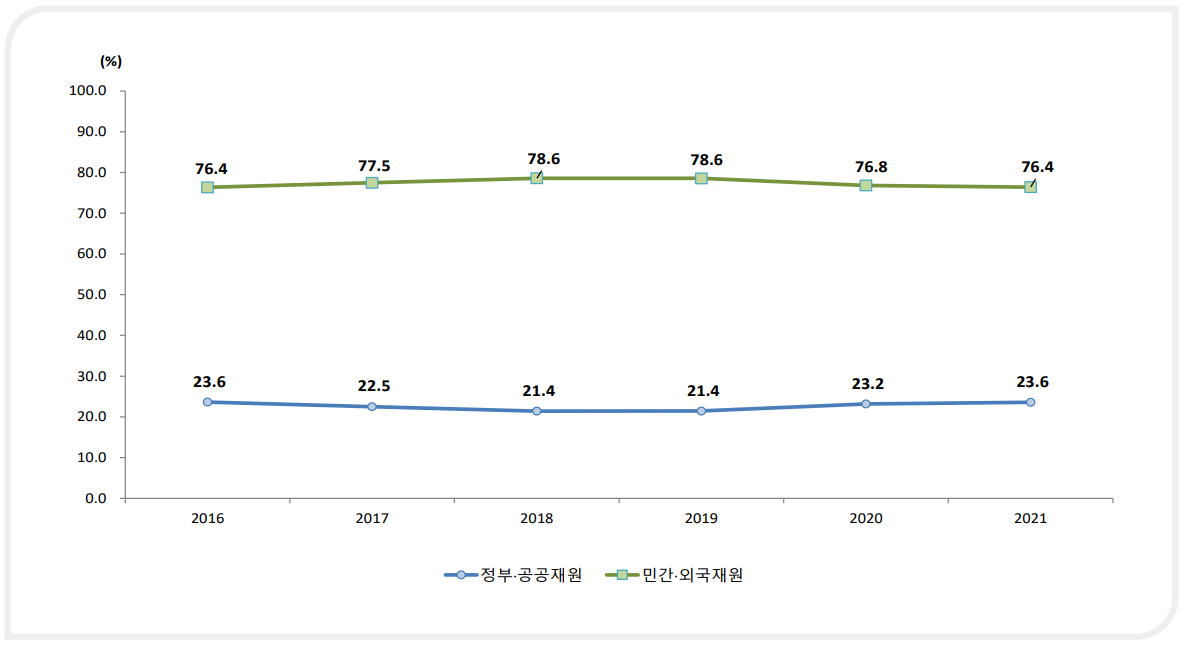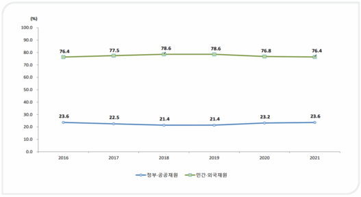 Research & Development, R&D 예산은 연구개발을 위해 정부와 민간기업이 지원하는 자금이다. R&D 예산은 크게 민간기업에서 투자하는 기업 R&D 예산과 정부에서 투자하는 정부 R&D 예산으로 나뉜다. 한국과학기술기획평가원(KISTEP)이 작년 12월에 발간한 「2021년 우리나라와 주요국의 연구개발투자 현황」에 따르면 2016년부터 2021년에 이르기까지 정부 R&D 예산이 총 R&D 예산에서 차지하는 비중은 20%대를 유지하고 있다.