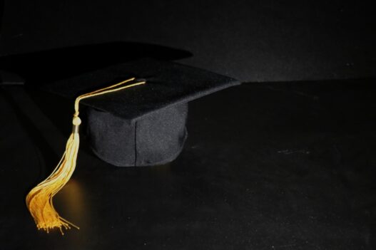 사진 설명 시작. 검은색 배경에 학사모가 놓여 있다. 학사모 위로는 노란색 수술이 늘어져 있다. 사진 설명 끝.