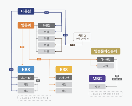 국가는 공영방송이 방송의 공공성과 공익성을 제대로 보장하고 있는지 감독해야 한다. 국민에 의해 권한을 위임받은 정부가 공영방송을 관리할 책임이 있기 때문이다. 대표적으로 공영방송국의 이사회는 방통위의 추천에 따라 대통령이 임명함으로써 구성된다. 방송법에 따르면 〈KBS〉 이사회는 이사장을 포함한 이사 11인으로 구성되는데, 이사는 방통위의 추천을 통해, 사장과 감사는 이사회의 제청을 통해 최종적으로 대통령이 임명한다. 〈EBS〉의 이사회는 이사 9인으로 구성되며, 이사와 사장, 감사까지 전부 방통위에서 임명한다. 〈MBC〉의 경우 방문진이 관리감독기구로서 존재해 국가의 관리 감독을 매개한다. 이사장을 포함해 이사 9인으로 구성되는 방문진의 이사회는 방통위가 임명한다. 〈MBC〉의 사장은 주식회사의 특성상 방문진 이사 과반수가 추천한 사람이 주주총회의 승인을 거쳐 임명된다.