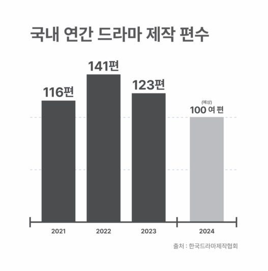 드라마의 제작과 편성이 주춤한 이유는 무엇일까. 결국 핵심은 제작비다. 최근 몇 해 동안 제작된 유명 한국 드라마의 한 작품당 제작비 규모는 400억에서 500억 원을 상회한다. 작년 하반기 화제작《무빙》의 경우 750억 원이 들었고, 《경성 크리처》는 700억 원이 들었다. 로맨틱 코미디 장르임에도 《눈물의 여왕》은 400억 원가량이 들었다. 가수 겸 배우 아이유 주연의 제주 배경 시대극 《폭싹 속았수다》는 무려 600억 원짜리다. 넷플릭스를 필두로 한 글로벌 사업자의 등장으로 대규모 자본이 집약적으로 투자된 작품들이 전체적인 완성도를 높여 전 세계 대상의 흥행에 성공하자, 드라마 제작에 필요하다고 여겨지는 제작비의 규모 자체가 거대해진 것이다. 김유정 전문연구위원은 2018년 드라마 《미스터선샤인》의 제작비가 430억 원가량이었다는 사실을 언급하며 “그에 비해 지난 10년간 지상파 방송 시장규모는 2천억 정도 성장하는 데 그쳤다”고 설명했다. 이처럼 국내 방송시장의 확장성이 매우 제한적임을 고려했을 때, 한 작품에 400억 원을 우습게 넘기는 최근의 드라마 제작비는 매우 높은 상황이다.