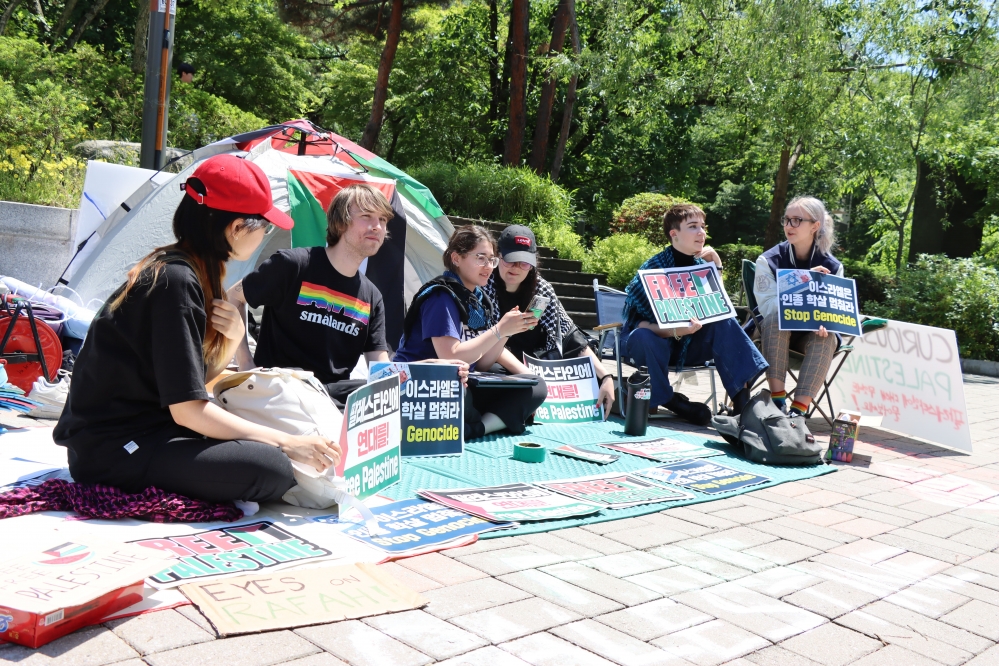 지난 8일, 서울대 팔레스타인 연대 동아리 ‘수박’이 자하연 앞에서 연좌 농성을 진행했다. 수박은 한국 대학 최초의 팔레스타인 관련 동아리로, 학내외에서 팔레스타인을 지지하는 활동을 진행하고 있다. 이날 수박 회원들은 팔레스타인 국기를 단 텐트를 설치하고, 인종 학살에 맞서 팔레스타인을 지지하는 문구가 담긴 피켓을 들었다.