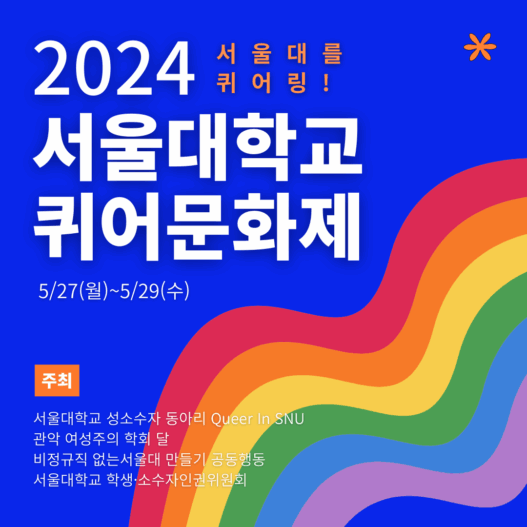 지난 27일부터 사흘간 학내 캠퍼스에서 ‘2024 서울대학교 퀴어문화제: 서울대를 퀴어링!(퀴어문화제)’이 열렸다. 퀴어를 대주제로 내건 문화제가 학내에서 열린 건 이번이 처음이다. 일자별로 각기 다른 연사가 방문해 관객들과 다채로운 이야기를 나눴다. 이번 퀴어문화제는 서울대학교 성소수자 동아리 Queer In SNU(QIS, 큐이즈), 관악 여성주의 학회 달, 비정규직 없는 서울대 만들기 공동행동, 그리고 서울대학교 학생·소수자인권위원회가 공동으로 주최했다.