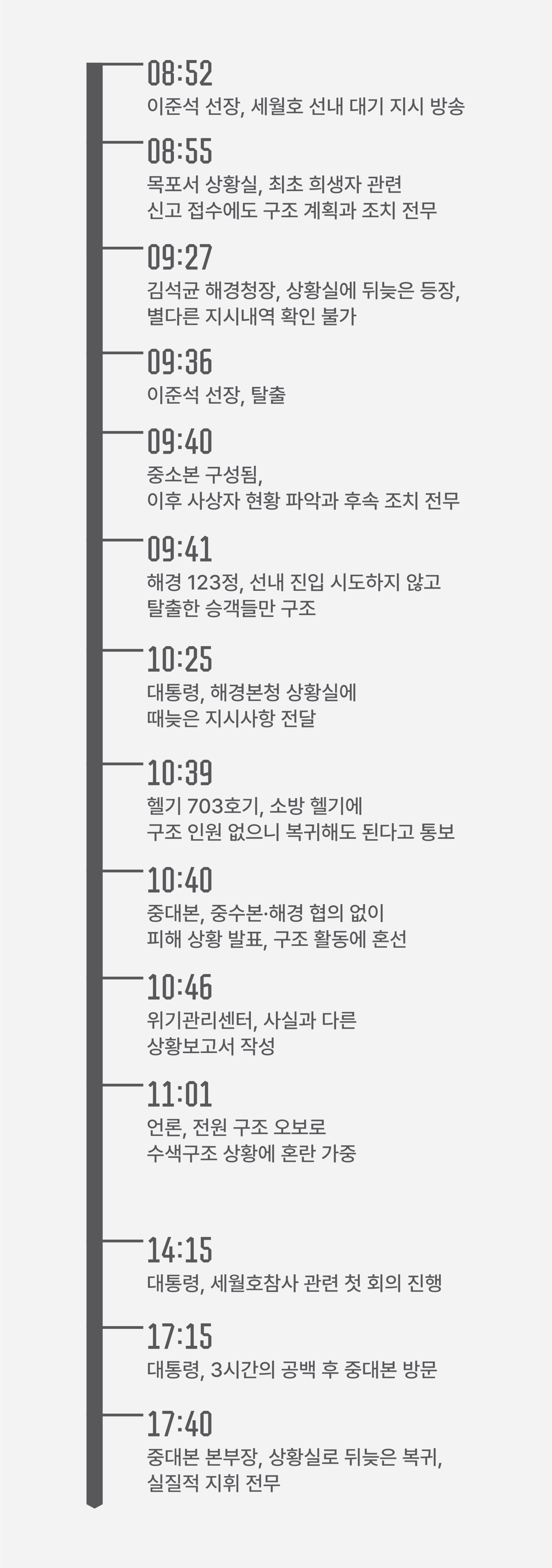 현장 바깥도 별반 다르지 않았다. 사상자 현황 파악과 후속 조치 지시 등의 임무에 충실하지 않았던 중앙사고수습본부(중수본)와 17시 40분에야 본부장이 복귀한 중앙재난안전대책본부(중대본)은 구조 활동에 미력도 보태지 못했다. 즉각적인 구조 명령 없이 정부 보고만을 외쳤던 해양안전부와 상황 확인 이후에도 침묵했던 정부 각처, 상황을 파악하고도 중대본에 도착하기까지 7시간을 낭비한 박근혜 전 대통령 모두 재난의 컨트롤타워가 되기는커녕 참사의 중대한 패착이 됐다.