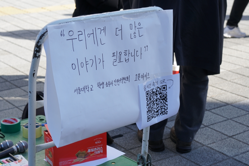 지난 18일 학생회관 앞에서 학생·소수자인권위원회(학소위)의 주최로 오픈마이크 행사 ‘우리에겐 더 많은 이야기가 필요합니다’가 열렸다. 이번 행사는 지난 5일 개최된 전체학생총회(학생총회)에서 논의되지 못한 것들에 대해 자유롭게 발언할 자리를 만든다는 취지로 마련됐다. 사전에 신청한 발언자들이 현 시국을 둘러싼 학생사회와 광장의 면면을 짚었다.