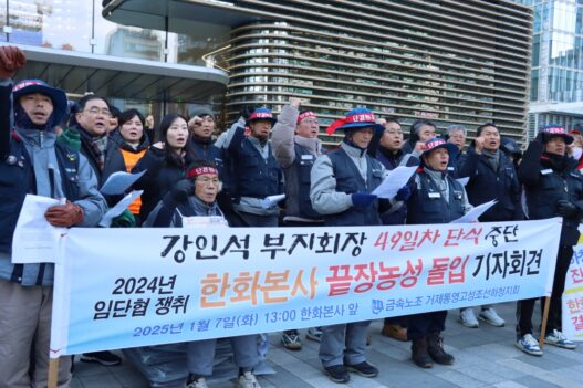 한화오션(옛 대우조선해양)의 단체교섭 타결을 촉구하는 하청노동자의 단식 투쟁이 49일째인 지난 7일 중단됐다. 금속노조 거제통영고성조선하청지회(조선하청지회)는 이날 오후 1시 서울 한화그룹 본사 앞에서 기자회견을 열어 강인석 부지회장의 단식 중단을 알리고, 본사 건물 앞에서 농성에 돌입한다고 밝혔다.