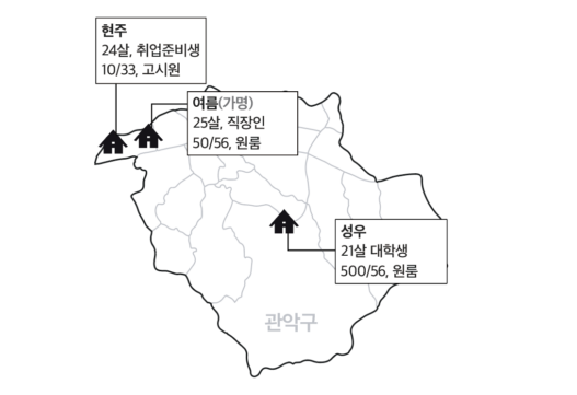사진 설명 시작. 관악구 지도 위에 세 명의 청년 거주자가 표시된 인포그래픽. 각 인물의 나이, 신분, 주거 형태 및 임대 조건이 텍스트 박스로 설명되어 있음. 현주: 24세, 취업준비생, 고시원 거주, 월세 10만 원 / 보증금 33만 원. 여름(가명): 25세, 직장인, 원룸 거주, 월세 50만 원 / 보증금 56만 원. 성우: 21세, 대학생, 원룸 거주, 월세 56만 원 / 보증금 500만 원. 사진 설명 끝.