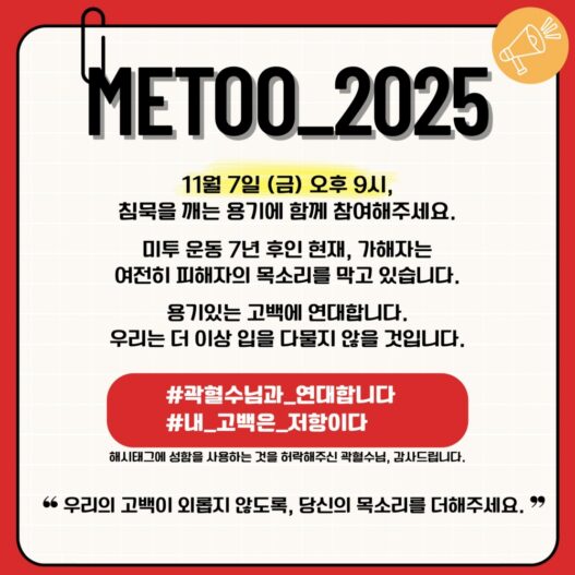 사진설명 시작. 온라인 포스터. 상단에는 “METOO_2025”라는 문구가 크고 검은 글씨로 적혀 있고, 그 아래에는 “11월 7일(금) 오후 9시, 침묵을 깨는 용기에 함께 참여해주세요.”라는 문장이 강조되어 있다. 포스터는 “가해자는 여전히 피해자의 목소리를 막고 있다”는 문장과 “용기 있는 고백에 연대합니다”라는 메시지를 담고 있으며, 하단에는 붉은색 해시태그 “#곽혈수님과_연대합니다”와 “#내_고백은_저항이다”가 배치되어 있다. 사진설명 끝.