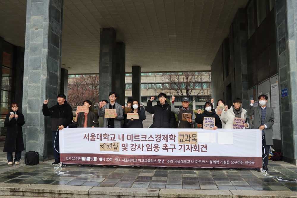 ‘서울대학교 내 마르크스경제학 개설을 요구하는 학생들(서마학)’이 11월 27일 마르크스경제학 교과목 재개설을 요구하는 기자회견을 열었다. 이번 기자회견은 2025학년도 동계 계절학기에 마르크스경제학 교과목이 개설되지 않은 것을 비판하기 위해 마련됐다.