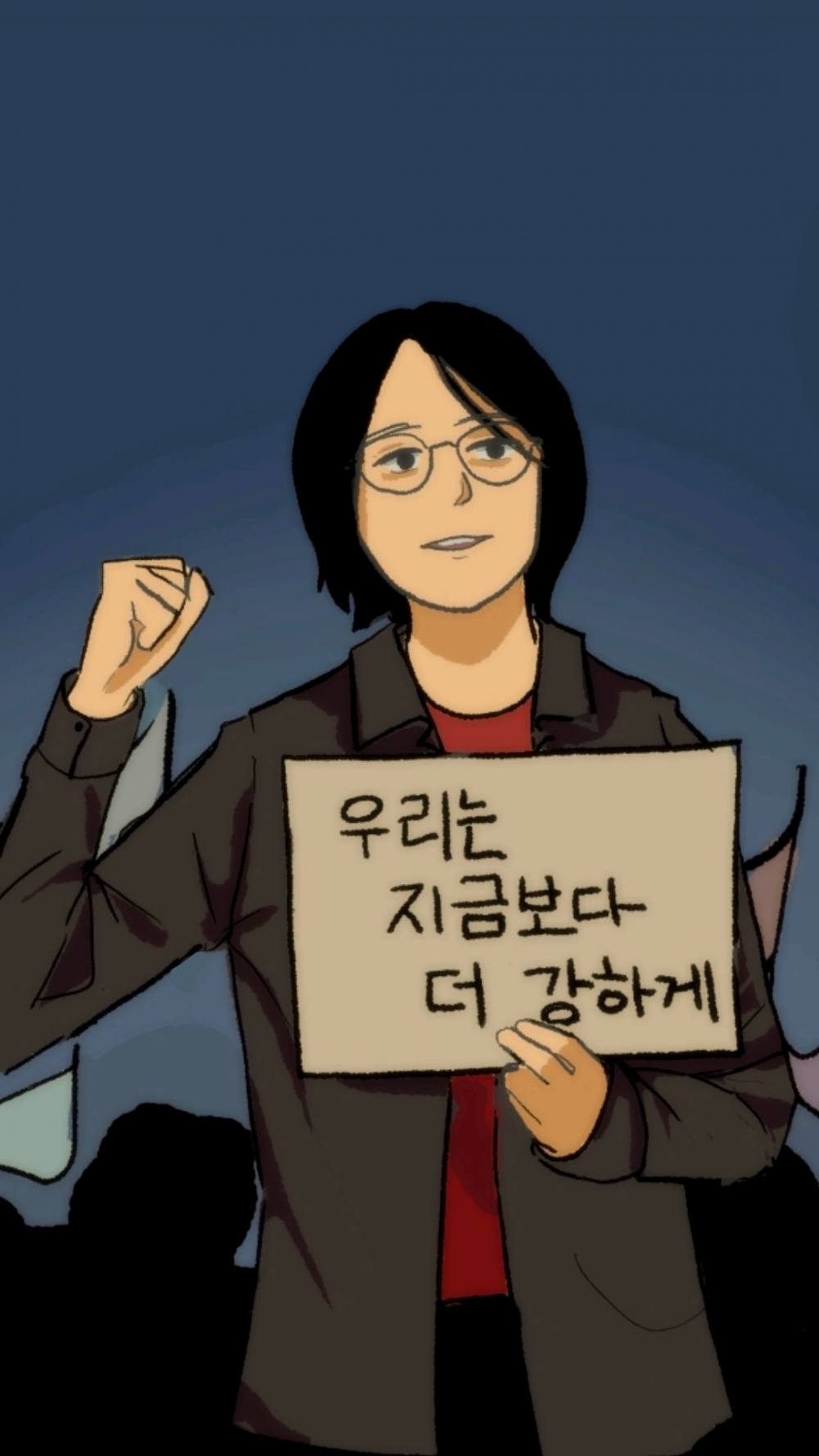 사진설명 시작. 만화풍의 그림이다. 우리는 지금보다 더 강하게라는 팻말을 든 사람이 있다. 사진설명 끝.