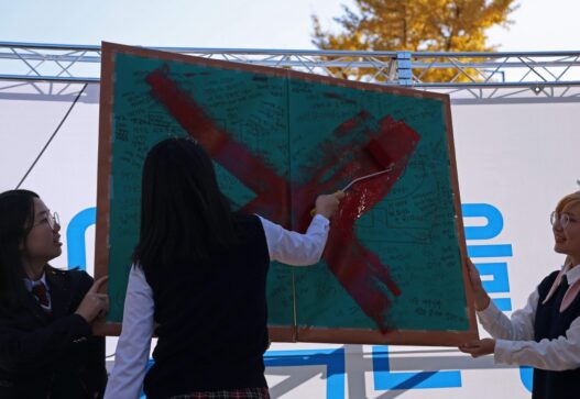 사진설명 시작. 교복을 입은 학생들이 무대에 올라 초록색 판 위에 빨간 물감으로 엑스 자를 칠하고 있다. 칠판 모양의 판 위에는 글씨가 빼곡히 쓰여있다. 사진설명 끝.